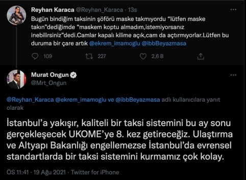 “Bugün bindiğim taksinin şoförü maske takmıyordu “lütfen maske takın” dediğimde “maskem koptu almadım, istemiyorsanız inebilirsiniz” dedi. Camlar kapalı kilime açık, cam da açtırmıyorlar. Lütfen bu duruma bir çare artık.”