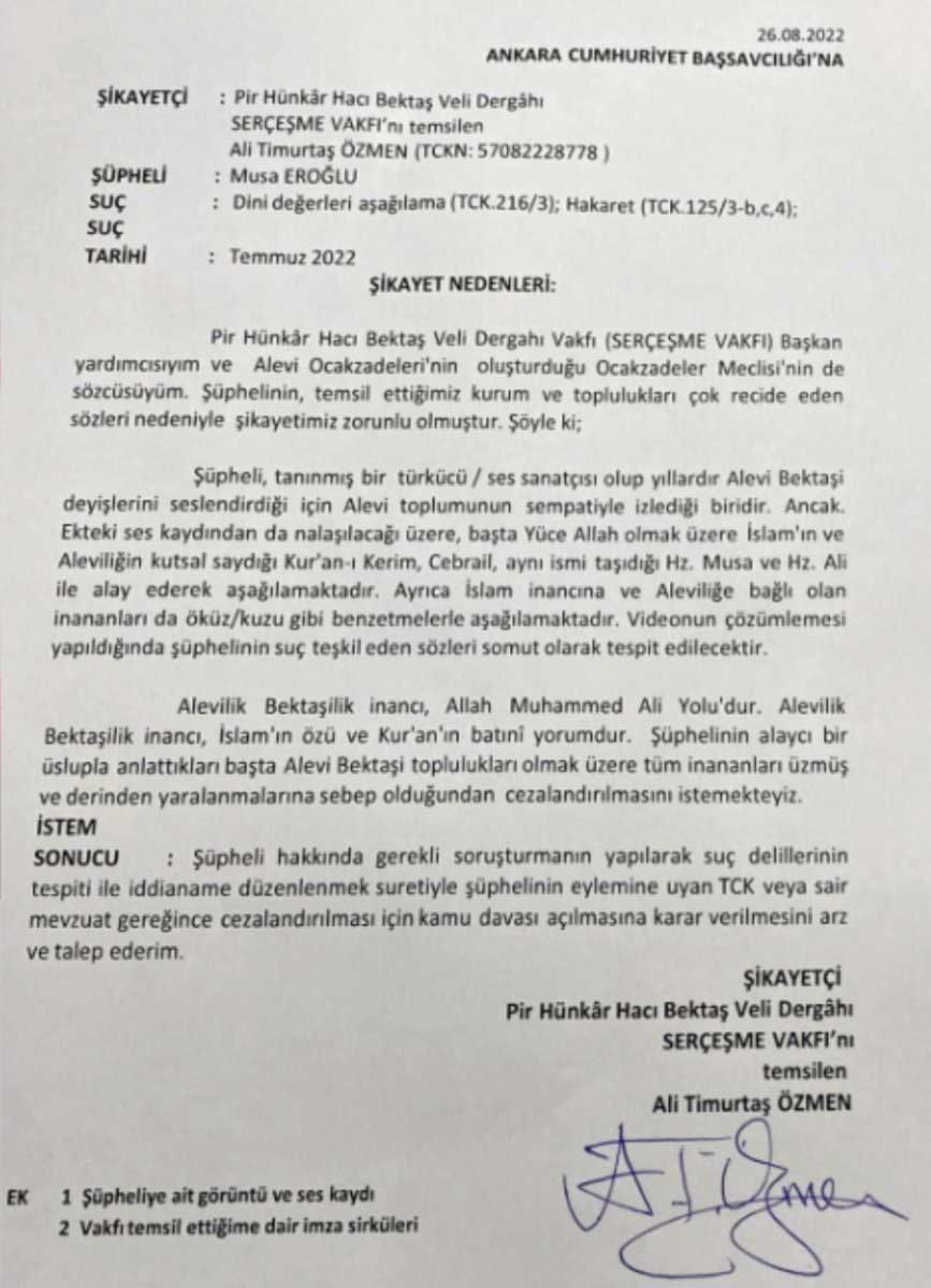 Türkücü Musa Eroğlu'nun Hz. Ali'ye yönelik ifadeleri sonrası hakkında suç duyurusunda bulunuldu.