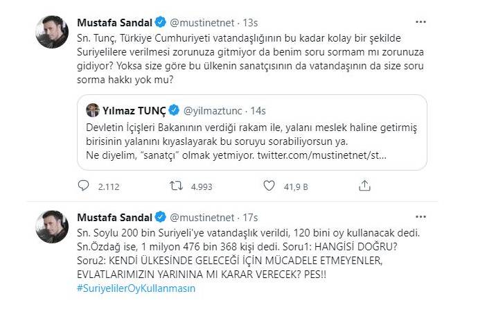Şarkıcı Mustafa Sandal, İçişleri Bakanı Süleyman Soylu ile Zafer Partisi Genel Başkanı Ümit Özdağ'ın, seçmen yapılan Suriyeliler konusunda birbirinden çok farklı rakamlar vermesini gündeme getirdi. Sosyal medyadan paylaşım yapan Mustafa Sandal, "Sn. Soylu 200 bin Suriyeli’ye vatandaşlık verildi, 120 bini oy kullanacak dedi. Sn. Özdağ ise, 1 milyon 476 bin 368 kişi dedi. Soru1: Hangisi doğru? Soru2: Kendi ülkesinde geleceği için mücadele etmeyenler, evlatlarımızın yarınına mı karar verecek? Pes!!" şeklinde yazdı.