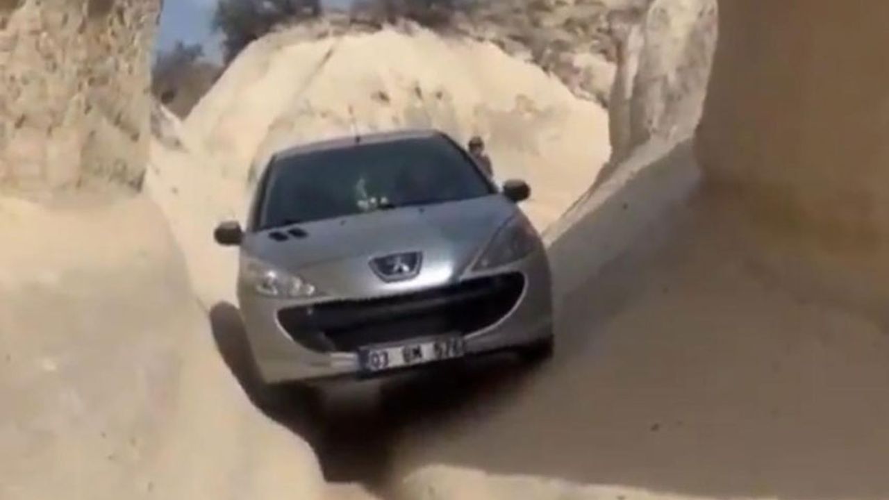 Türkiye’nin önemli turizm merkezlerinden olan Kapadokya bölgesini ziyarete gelen sürücü, navigasyonun yanlış yönlendirmesi sonrası taşıt trafiğine kapalı yola girip, peri bacalarındaki kayalıklar arasında ilerledi. O anlar, cep telefonu kamerasına yansırken, görüntüler de sosyal medyada gündem oldu.