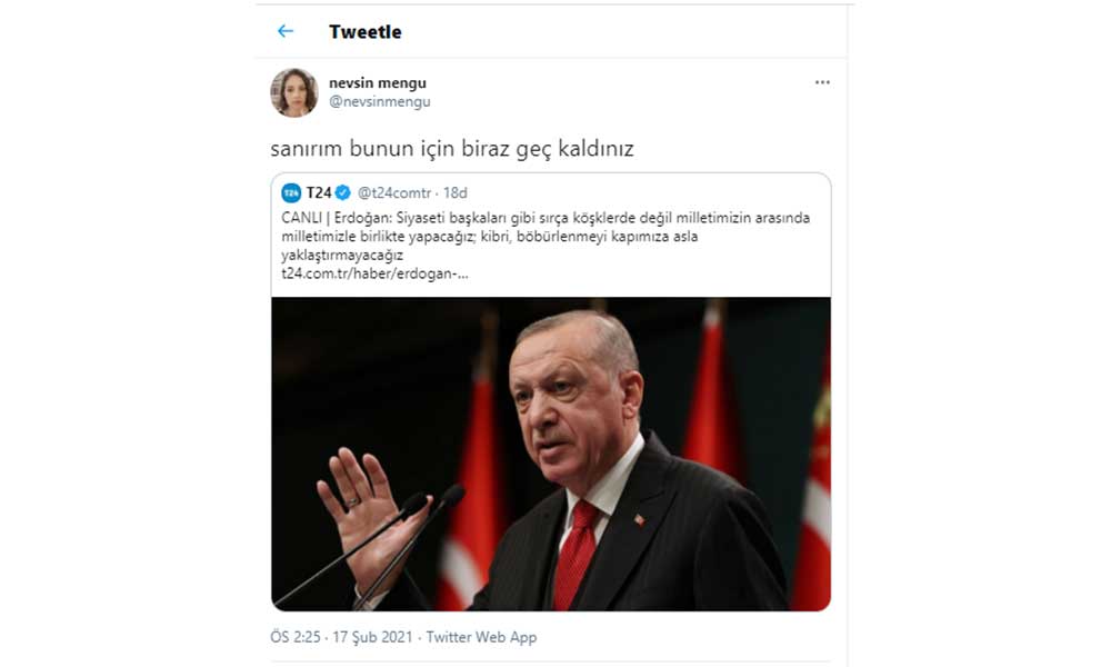 Erdoğan, "Kimi savunuyor, Selo'yu savunuyor. Bunların suçlu olmadığına adeta hükmediyor. Bizim teröristleri savunmak gibi bir derdimiz olamaz. Siyaseti başkaları gibi sırça köşklerde değil milletimizin arasında yapacağız. Kibri kapımıza asla yaklaştırmayacağız." ifadelerini kullanmıştı. Nevşin Mengü, "Sanırım bunun için biraz geç kaldınız" ifadeleriyle Erdoğan'ın açıklamasına tepki gösterdi.