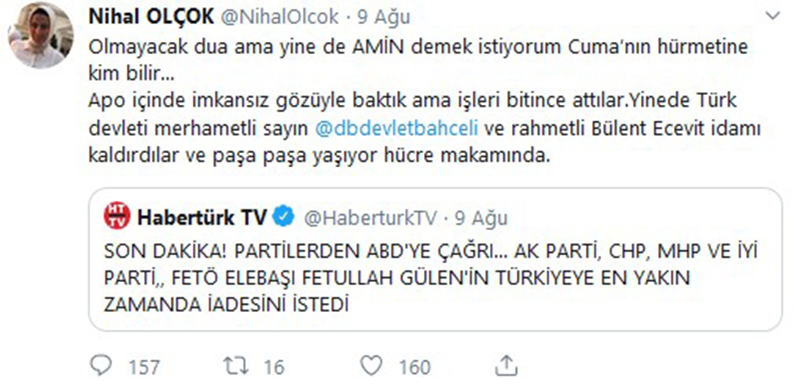 Nihal Olçok, sosyal medya hesabından; AKP, CHP, İYİ Parti ve MHP’nin terör örgütü FETÖ lideri Fethullah Gülen’in iadesi için ABD’ye yaptıkları çağrının bulunduğu bir gönderiyi MHP lideri Devlet Bahçeli’yi ekleyerek paylaştı. Nihal Olçok ile MHP arasında, sosyal medyadan idam polemiği yaşandı.