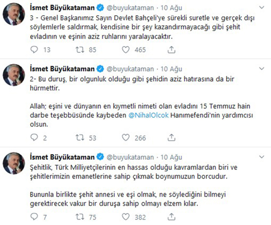 Nihal Olçok’un Devlet Bahçeli’yi ekleyerek bu hatırlatmayı yapması üzerine, MHP Genel Sekreteri ve Bursa Milletvekili İsmet Büyükataman, Olçok’a sosyal medya hesabından yanıt verdi. Büyükataman da mesajında Nihal Olçok’u ekleyerek, “Sayın Devlet Bahçeli'ye sürekli suretle ve gerçek dışı söylemlerle saldırmak, kendisine bir şey kazandırmayacağı gibi şehit evladının ve eşinin aziz ruhlarını yaralayacaktır” diye yazdı.