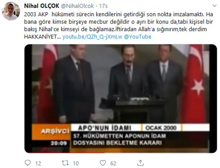 Nihal Olçok da Büyükataman’ın bu mesajları sonrasında, “İftiradan Allah’a sığınırım, tek derdim hakkaniyet...” diye yazdı ve bir Youtube videosu paylaştı. O videoda dönemin Başbakan’ı Ecevit ile Başbakan Yardımcıları Bahçeli ve Yılmaz yer alıyor. Video, Öcalan’ın idamının askıya alınması konusu işleniyor.