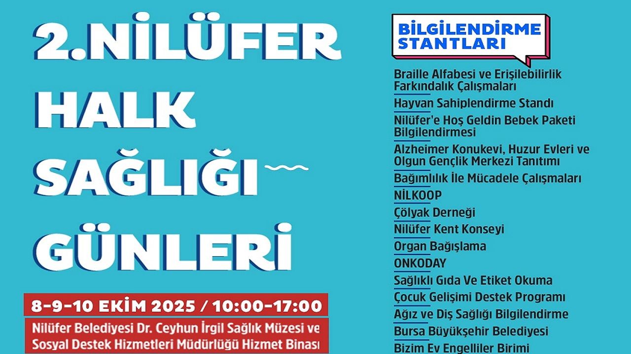 Etkinlik alanında kurulacak bilgilendirme stantlarında ise Nilüfer Belediyesi’nin ilgili birimlerinin yanı sıra Bursa Büyükşehir Belediyesi, Çölyak Derneği ve ONKODAY gibi kurumlar da yer alacak. Bu stantlarda; organ bağışından bağımlılıkla mücadeleye, Alzheimer’den hayvan sahiplendirmeye, sağlıklı gıda ve etiket okumadan Braille alfabesine kadar geniş bir yelpazede farkındalık çalışmaları yürütülecek.