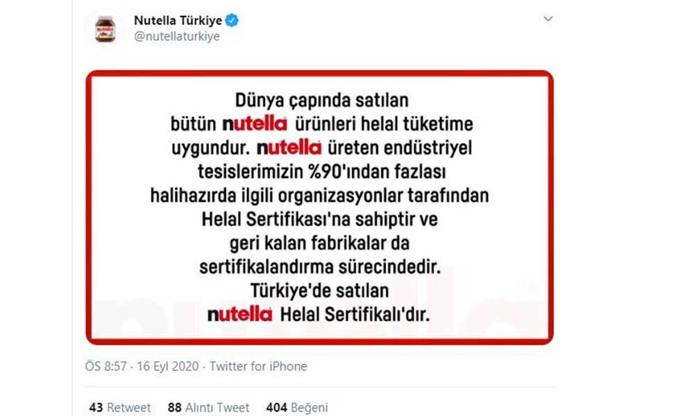 Şirket daha sonra Twitter'dan ikinci bir mesaj yayınlayarak ; "Dünya genelinde satılan tüm Nutella ürünlerinin helal tüketime uygun olduğu belirtilirken, üretim tesislerinin yüzde 90'ından fazlasının helal sertifikasına sahip olduğu ve kalan fabrikaların da sertifikalandırma sürecinde" ifadelerini kullandı.