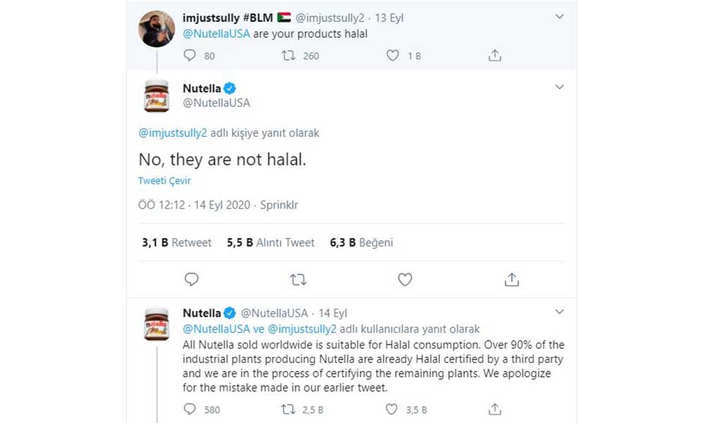 Bir tüketicinin Twitter'dan sorduğu "Nutella helal mi?" sorusuna verilen "Hayır, helal değil" yanıtı sonrası şirket ikinci bir açıklama yaparak ilk mesajını yalanladı.