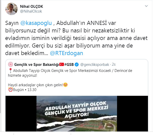 Gençlik ve Spor Bakanlığı'nın tesisin açılışı ile ilgili yaptığı paylaşımayanıt veren Nihal Olçok, "Sayın @kasapoglu, Abdullah’ın ANNESİ var biliyorsunuz değil mi? Bu nasıl bir nezaketsizliktir ki evladımın isminin verildiği tesisi açılıyor ama anne davet edilmiyor. Gerçi bu sizi aşar biliyorum ama yine de davet bekledim.." diyerek Gençlik ve Spor Bakanı Muharrem Kasapoğlu’na tepki gösterdi. Ahmet Davutoğlu tarafından kurulan Gelecek Partisi'nin kurucuları arasında da yer alan Nihal Olçok, yaptığı paylaşıma AKP'li Cumhurbaşkanı Recep Tayyip Erdoğan'ı da etiketledi.