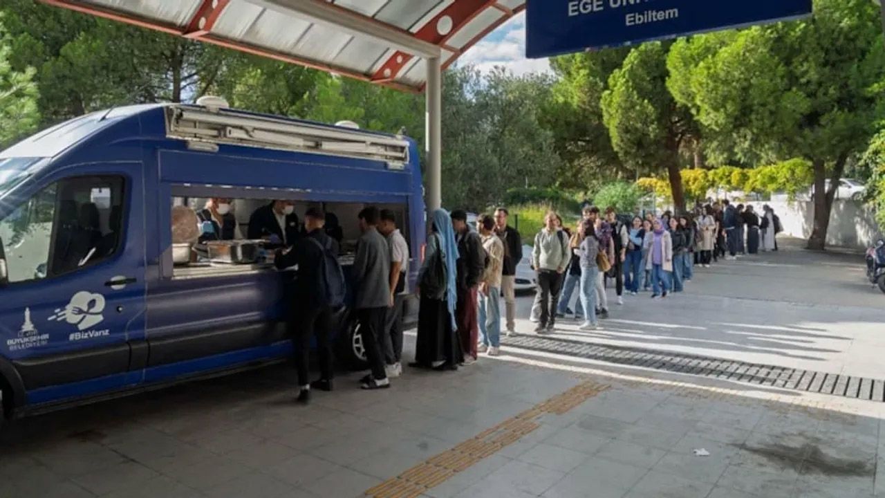 İzmir Büyükşehir Belediyesi’nin başlattığı ücretsiz sıcak yemek dağıtımı uygulaması, öğrencilerin en çok rağbet ettiği desteklerden biri haline geldi. Kentteki altı devlet üniversitesinin kampüsleri yakınında her gün dağıtılan sıcak yemekler için öğrenciler uzun kuyruklarda bekliyor.