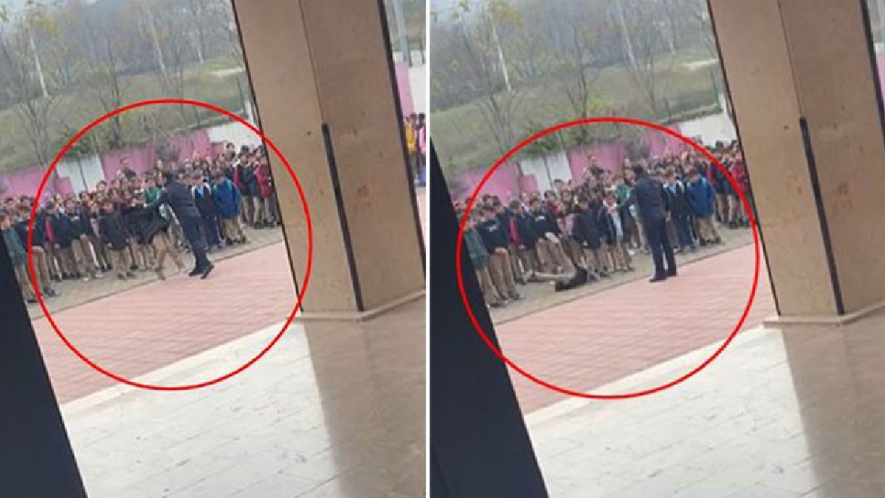 Mustafa Ç., yakasından tuttuğu öğrenciyi, ittirdi. Muhammed K., geriye doğru savrulup yere düşerken, o anlar cep telefonuyla görüntülendi.