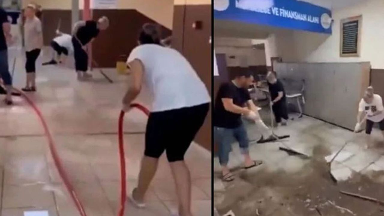Öğretmenler ellerine süpürge, hortum alıp derslikleri yıkadı. Kadın ve erkek öğretmenlerin kimi hortumla su tuttu kimi paspas çekti kimi de süpürgeye sarılıp okulda temizlik yaptı.