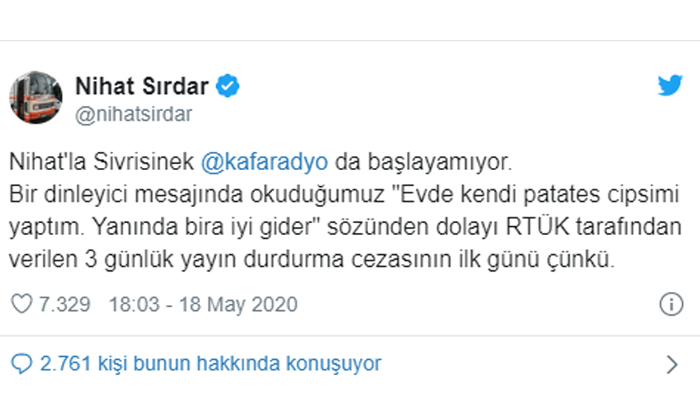 Tecrübeli radyocu, Twitter hesabından "Nihat'la Sivrisinek @kafaradyo da başlamıyor." diyerek cezanın ilk günü olduğunu duyurdu.