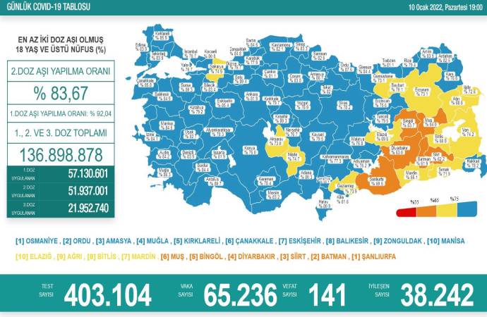 Omicron varyantının etkileri Türkiye'de görülmeye devam ediyor. Bakan Koca'nın paylaştığı verilerek göre Türkiye'de 24 saat içinde 403 bni 104 kişi test yaptırdı, bunların 65 bin 238'sının koronavirüs testi pozitif çıktı. Koronavirüs nedeniyle hayatını kaybedenlerin sayısı ise 141... Bakan Koca omicron varyantının hızlı bulaştığını vurgulayarak şunları söyledi:"Omicron varyantının hızlı bulaştığını belirtmiştik. Bu özellik, kişisel tedbirlerin önemini artırdı. Maske, ağzı ve burnu kapatacak şekilde takılmalı; sosyal mesafeye daha çok dikkat edilmelidir. Teste bile ihtiyaç duymamak, hastalığın en hafifinden de çok daha iyi değil mi?"