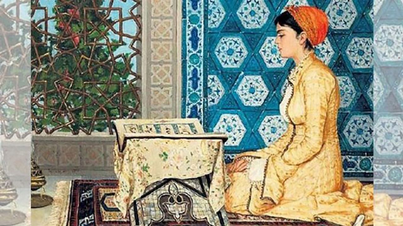 Tuval üzerine yağlıboya olan 41,1X51 santimetre ebadındaki eserde, rahledeki Kur’an-ı Kerim’in önünde diz çökmüş genç bir kadın var.