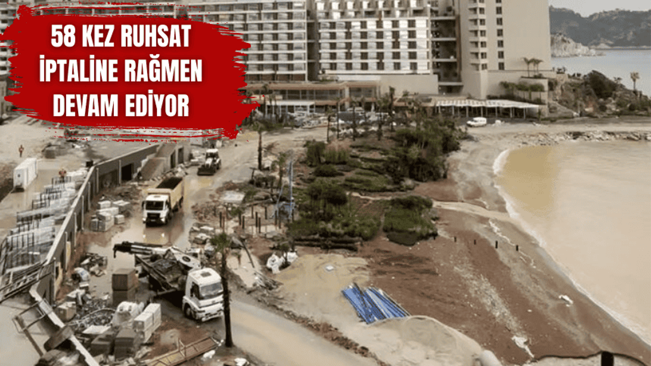 Muğla Marmaris'te 3 milyar liranın üzerinde ceza 58 ruhsat iptaline rağmen 24 saat inşaat faaliyetlerini yürüten Kızılbük Otel Projesi kıyıyı tanınmaz hale getirdi.