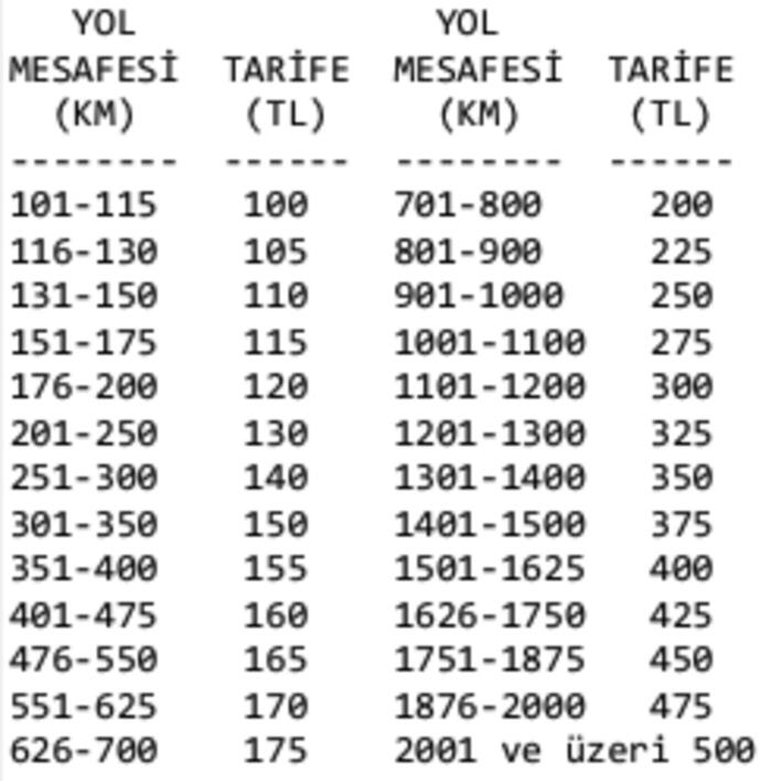 NOT: Çanakkale Boğazı geçişli hatlarda tablodaki ücretlere geçiş ücreti eklenerek uygulama yapılacaktır.