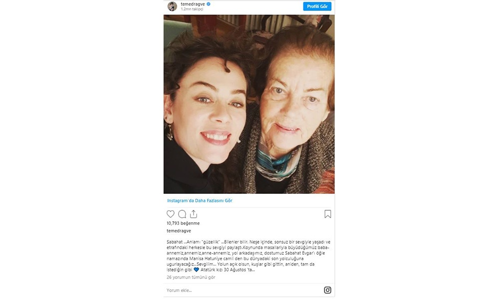 Tanınmış sanatçı Demet Evgar, Instagram hesabından yaptığı paylaşımla babannesini kaybettiğini duyurarak şu ifadeleri kullandı: Sabahat ...Anlamı "güzellik" ...Bilenler bilir nese içinde, sonsuz bir sevgiyle yaşadı ve etrafındaki herkesle bu sevgiyi paylaştı.Koynunda masallariyla büyüdüğümüz baba-annemiz,annemiz,anne-annemiz, yol arkadaşımız, dostumuz Sabahat Evgar'ı öğle namazında Manisa Hatuniye camii den bu dünyadaki son yolculuğuna ugurlayacağız...Sevgilim... Yolun açık olsun, kuşlar gibi gittin, aniden, tam da istediğin gibi ???? Atatürk kızı 30 Ağustos 'ta...