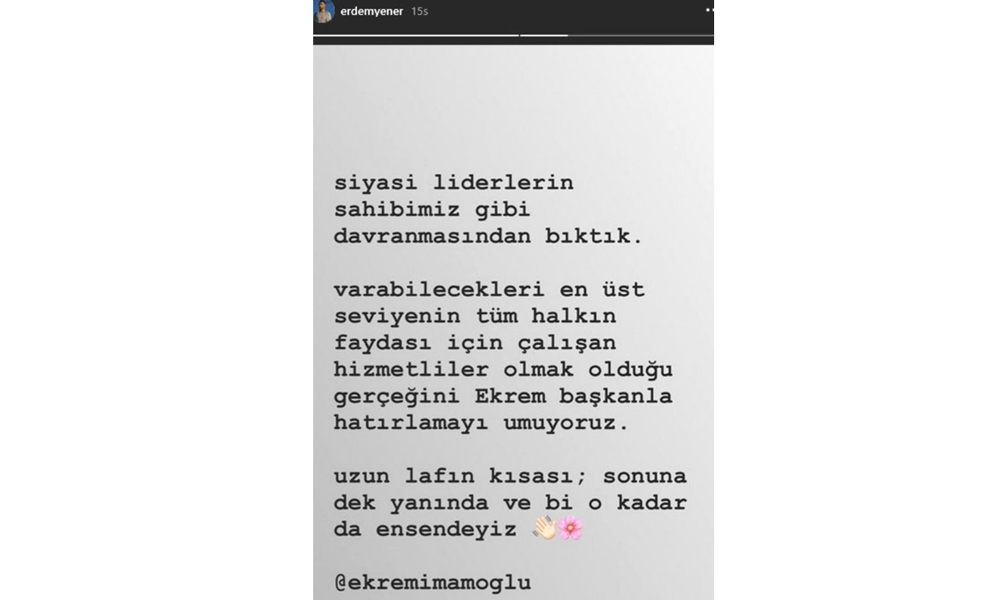 Oyuncu Erdem Yener, sosyal medya hesabından yaptığı paylaşımda, “Siyasi liderlerin sahibimiz gibi davranmasından bıktık. Varabilecekleri en üst seviyenin tüm halkın faydası için çalışan hizmetliler olmak olduğu gerçeğini Ekrem başkanla hatırlamayı umuyoruz. Uzun lafın kısası sonuna dek yanında ve bir o kadar da ensendeyiz” ifadelerinde bulundu. İşte Erdem Yener’in o paylaşımı: