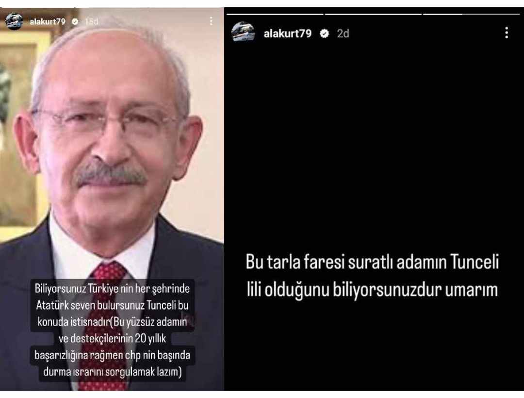 Adanalı dizisindeki ‘Maraz Ali’ karakteriyle tanınan, daha sonra oyunculuğu bırakıp İstanbul’dan taşınan Mehmet Akif Alakurt, CHP Lideri Kemal Kılıçdaroğlu ve memleketi Tunceli’yi sosyal medya hesabından yaptığı paylaşımla hedef aldı.