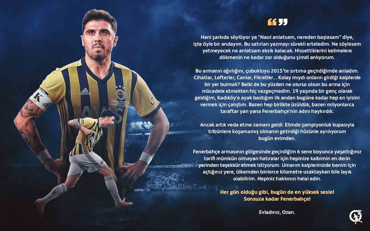 Fenerbahçe'den Watford'a transfer olan Ozan Tufan'ın sosyal medyadan yaptığı "Büyük Fenerbahçe Ailesine Sevgilerimle" başlıklı veda açıklaması şu şekilde: Hani şarkıda söylüyor ya 'Nasıl anlatsam, nereden başlasam" diye, işte öyle bir andayım. Bu satırları yazmayı sürekli erteledim. Ne söylesem yetmeyecek ne anlatsam eksik kalacak. Hissettiklerini kelimelere dökmenin ne kadar zor olduğunu şimdi anlıyorum. Bu armanın ağırlığını, çubukluyu 2015'te sırtıma geçirdiğimde anladım. Cihatlar, Lefterler, Canlar, Fikretler... Kolay mıydı onların girdiği kalplerde yer bulmak? Belki de bu yüzden ne olursa olsun bu arma için mücadele etmekten hiç vazgeçmedim. 19 yaşında bir genç olarak geldiğim, Kadıköy'e ayak bastığım ilk andan bugüne kadar hep en iyisini vermek için çalıştım. Bazen hep birlikte üzüldük, bazen milyonlarca taraftar yan yana Fenerbahçe'nin adını haykırdık. Ancak artık veda etme zamanı geldi. Elimde şampiyonluk kupasıyla tribünlere koşamamış olmanın getirdiği hüzünle ayrılıyorum bugün evimden. Fenerbahçe armasının gölgesinde geçirdiğim 6 sene boyunca yaşattığınız tarifi mümkün olmayan hatıralar için hepinize kalbimin en derin yerinden teşekkür etmek istiyorum. Umarım kalplerinizde benim için açtığınız yere, ülkemden binlerce kilometre uzaktayken bile layık olabilirim. Hepiniz hakkınızı helal edin. Her gün olduğu gibi, bugün de en yüksek sesle! Sonsuza kadar Fenerbahçe! Evladınız Ozan. Watford ise yeni transferi Ozan Tufan'ı yayınladığı bir video ile duyurdu
