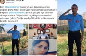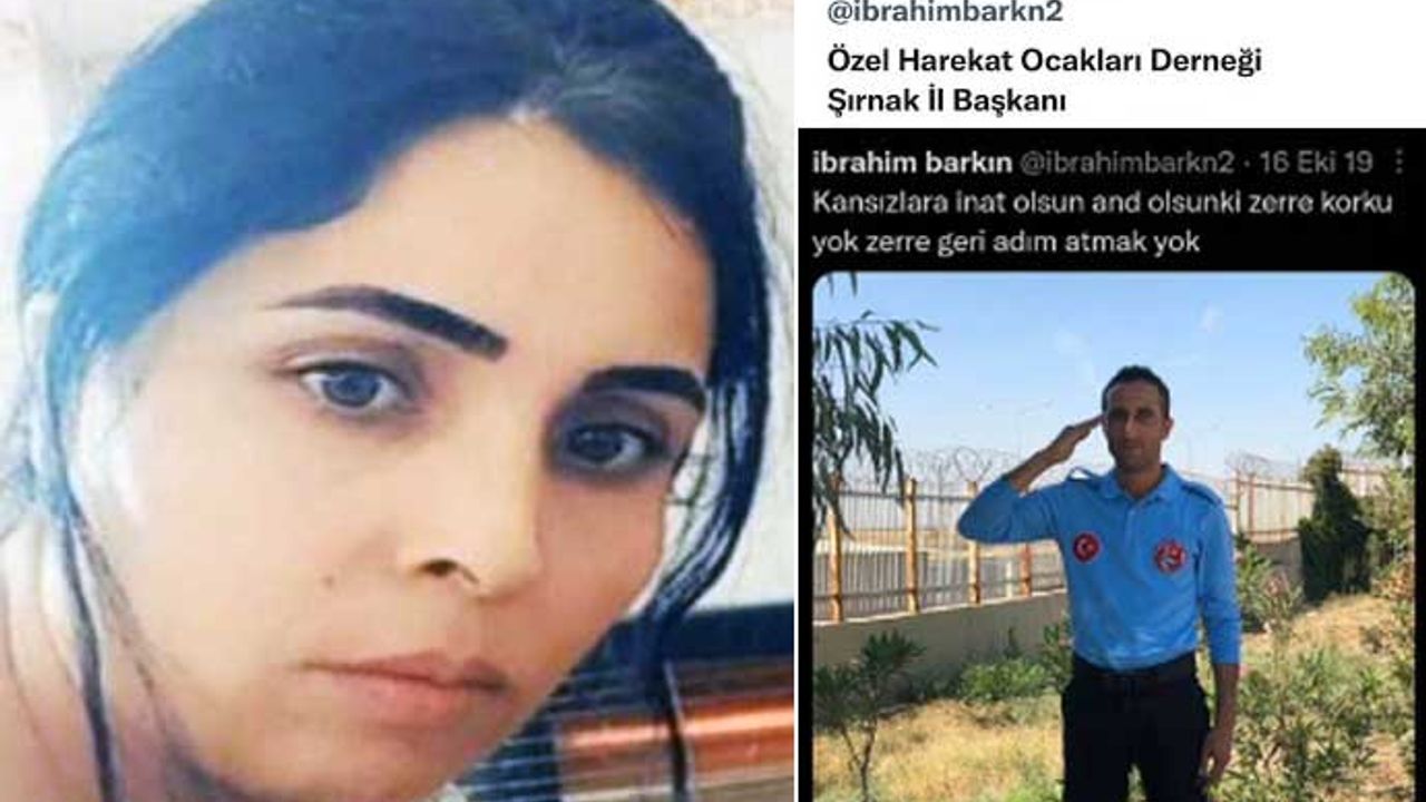 "İki gün önce Silopi’de vahşice katledilmiş olarak bulunan Sakine Kültür katili Şırnak Özel hareket başkanı İbrahim Barkın çıktı. Sakine'yi 4 yıl boyunca şantaj ve tehdit ile istismar etmiş, en son defalarca bıçakladıktan sonra yakıp yol kenarına atmış. #SakineKültür Kimlere bağlı oldukları belli olmayan bu dernek ve ocakların sahipleri kimlerdir? Ve ne maksatla oluşturulmuş kimse bilmiyor, kadınları tuzağına düşürmek toplumu dolandırmakla öne çıkan bu olaylar bir istisna değil, iktidarın yürüttüğü özel savaş politikalarının sonucudur. Sakine Kültür üç çocuk annesiydi, Bu vahşete karşı herkesi duyarlı olmaya davet ediyoruz. #SakineKültür"