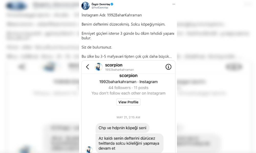 Twitter üzerinden paylaşım yapan Demirtaş, ''Instagram Adı: 1992 BaharKahraman. Benim defterimi düzecekmiş. Solcu köpeğiymişim. Emniyet güçleri isterse 3 günde bu ölüm tehdidi yapanı bulur. Siz de bulursunuz. Bu ülke bu 3-5 mafyavari tipten çok çok daha büyük'' dedi.