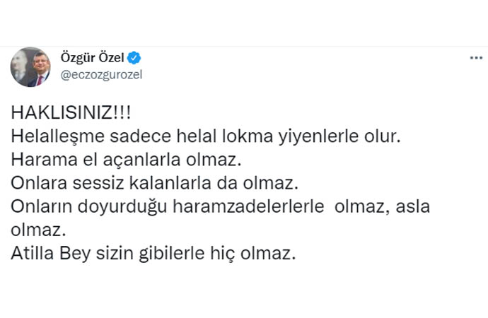 CHP Grup Başkanvekili Özgür Özel, sosyal medya hesabından yaptığı paylaşımla Yayla'ya tepki gösterdi. Özel, “Haklısınız!!! Helalleşme sadece helal lokma yiyenlerle olur. Harama el açanlarla olmaz. Onlara sessiz kalanlarla da olmaz. Onların doyurduğu haramzadelerle olmaz, asla olmaz. Atilla Bey sizin gibilerle hiç olmaz.” açıklamasında bulundu.