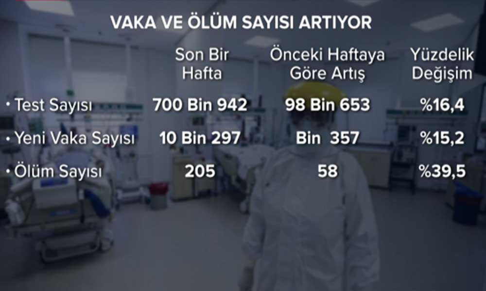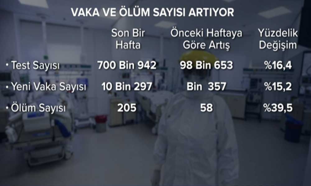 Veriler Sağlık Bakanlığının 24 ile 30 Ağustos'u içeren haftalık durum raporundan. Buna göre son bir haftada 700 binden fazla test yapıldı. Bu testlerde geçen haftaya oranla yüzde 15 artış ile toplam bin 357 yeni vaka tespit edildi. Ölüm sayısı da geçen haftaya göre yaklaşık yüzde 40 arttı. Ağustos'un son haftasında 205 kişi koronavirüs ile mücadelesinde hayatını kaybetti.