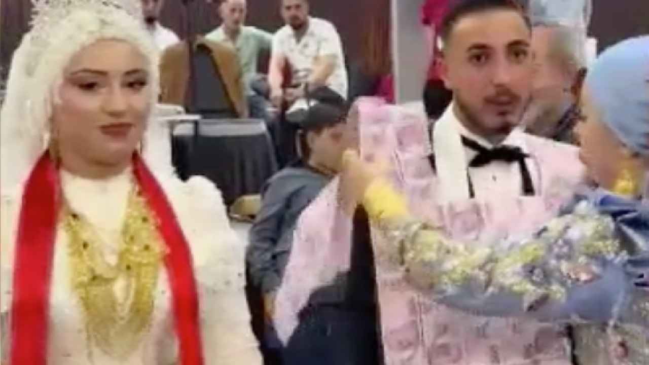 Gelin ve damadın üzeri banknotlarla kaplanırken o anlar cep telefonuyla görüntülendi. Sosyal medya platformlarında paylaşılan görüntüler ilgi gördü.