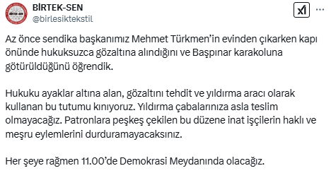 "Az önce sendika başkanımız Mehmet Türkmen’in evinden çıkarken kapı önünde hukuksuzca gözaltına alındığını ve Başpınar karakoluna götürüldüğünü öğrendik.