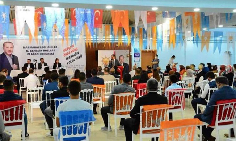 AKP Tekirdağ Marmaraereğlisi 6’ncı Gençlik Kolları Olağan Kongresi önceki gün belediye düğün salonunda yapıldı. Kongrede, delegelerin ve izleyicilerin oturacağı sandalyelerin arkasına Türk Bayrağı konuldu.