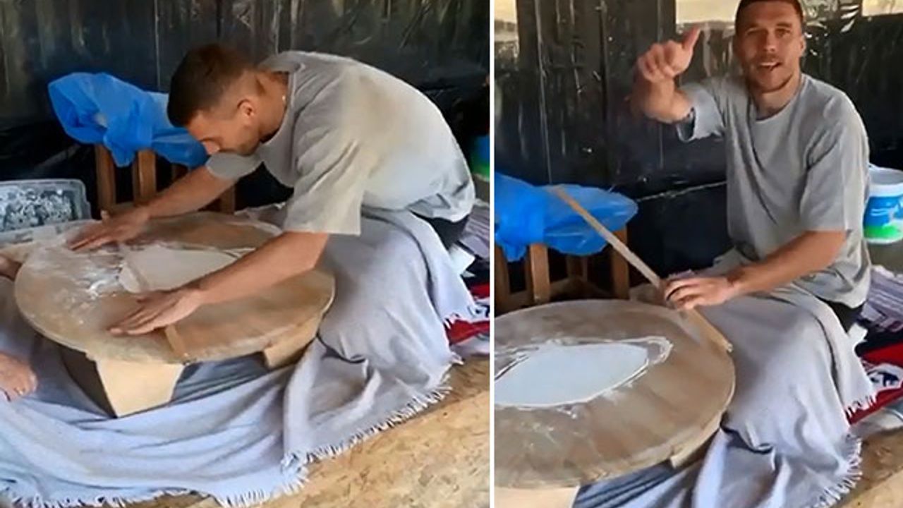 Podolski hamur açarken kendisini görüntüleyen Öztürk'e, "Başkan afiyet olsun" diye seslendi. Başkan Ali Şafak Öztürk cep telefonuyla bu anları kaydederek, sosyal medya hesabından paylaştı.