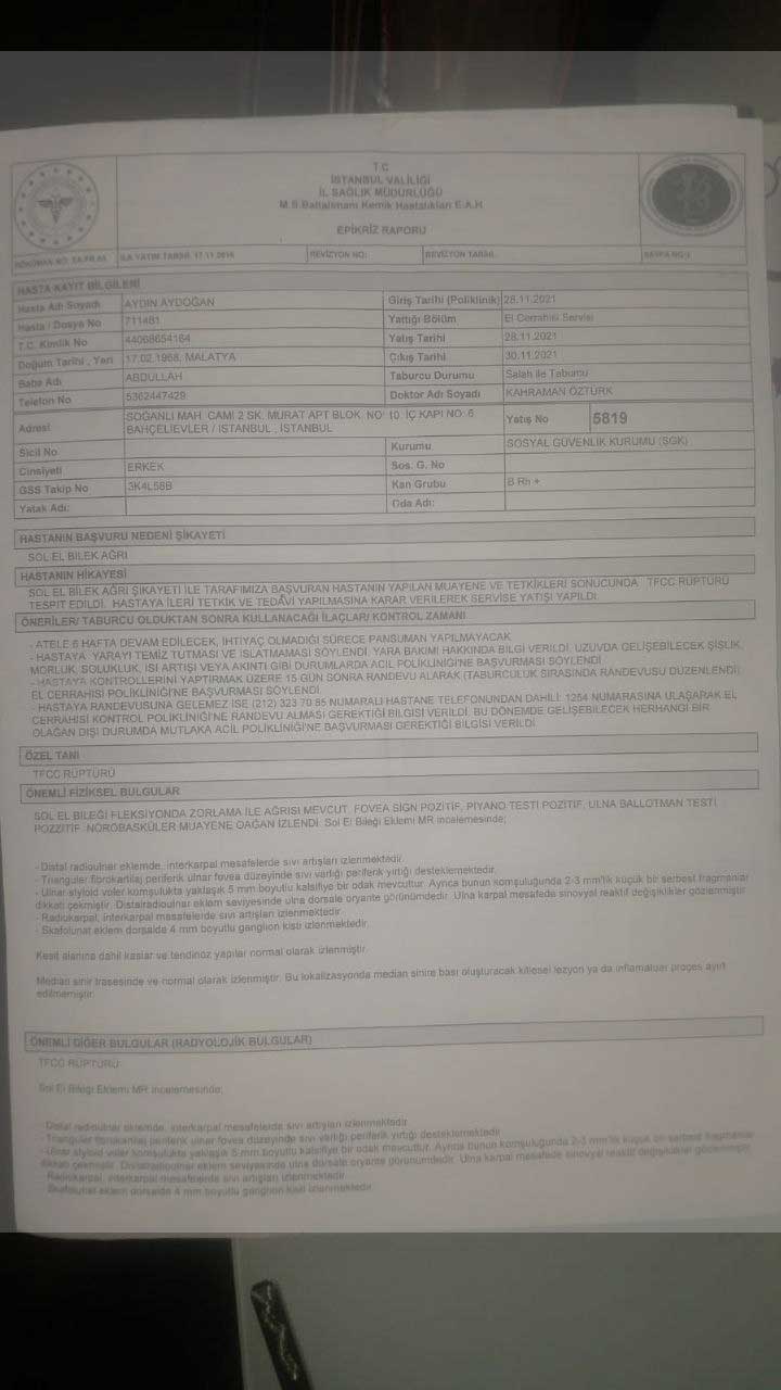 Saldırı nedeniyle kendinden geçmiş bir şekilde olay yerinde bulunan bir mekana sığındığını dile getiren Aydoğan, sonrasında kendi imkanları ve bir arkadaşının yardımıyla Haseki Eğitim Araştırma Hastanesine gittiğini ifade etti. Buradaki tetkiklerden sonra evine gönderildiğini belirten Aydoğan, “Ancak gece kolumun ağrısından uyuyamadım. Bakırköy Sadi Konuk Eğitim Araştırma Hastanesi’ne gittim. Sol kolum kırılmıştı. 45 günlük rapor verildi. Kolluk kuvvetinin hukuka aykırı şiddet eylemi neticesinde elimde oluşan kırıktan dolayı defalarca tedaviye tabi tutuldum ve en son olduğum ameliyat neticesinde sol elimi kullanma kabiliyetimi büyük oranda yitirdim” ifadelerine yer verildi.'TALİMATI SOYLU VERDİ'