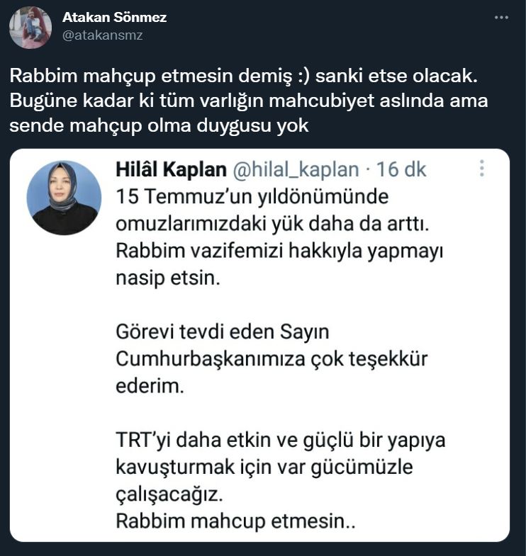 Kendisine ait sosyal medya hesabından paylaşım yapan yandaş Hilal Kaplan " 15 Temmuz’un yıldönümünde omuzlarımızdaki yük daha da arttı. Rabbim vazifemizi hakkıyla yapmayı nasip etsin. Görevi tevdi eden Sayın Cumhurbaşkanımıza çok teşekkür ederim. TRT’yi daha etkin ve güçlü bir yapıya kavuşturmak için var gücümüzle çalışacağız. Rabbim mahcup etmesin.." dedi.