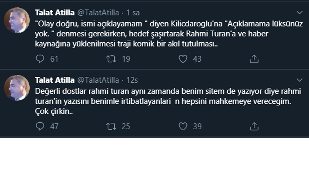 https://tele1.com.tr/rahmi-turan-kaynagimdan-supheliyim-ince-dogru-soyluyor-olabilir-dedi-103428/ Gazeteci Rahmi Turan’ın, “Beştepe’de AKP'li Cumhurbaşkanı Erdoğan ile görüşen CHP’li ismin Muharrem İnce” olduğunu söylemesinin ardından ortalık karıştı. İnce, iddiaları kesin bir dille yalanlarken; haberin kaynağının kim olduğu merak edilmeye başlandı. Sosyal medya kullanıcısı bir çok isim Turktime.com’un sahibi Talat Atilla’yı ‘haberin kaynağı’ olmakla suçladı. https://tele1.com.tr/gazeteciler-bildirgesi-yaniltirsa-kaynagini-acikla-diyor-103501/ Turktime.com’un sahibi Talat Atilla, hakkında sosyal medyada dolaşan ‘kaynak’ iddialarıyla ilgili Twitter hesabından açıklama yaptı. Talat Atilla mesajında “ Değerli dostlar rahmi turan aynı zamanda benim sitem de yazıyor diye rahmi turan’in yazısını benimle irtibatlayanlarin hepsini mahkemeye verecegim. Çok çirkin.. “ dedi.