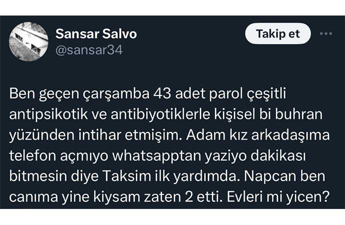 Ekincan Arslan, geçtiğimiz günlerde 43 farklı ilaç içerek intihara kalkıştığını açıkladı. Arslan intihar girişimine neden olarak bir süredir yaşadık ailevi olayları gösterdi. Eski kız arkadaşı, babası ve ailesinin de dahil olduğu olayları öfkeli bir dille anlatan Arslan "Ben geçen çarşamba 43 adet parol çeşitli antipsikotik ve antibiyotiklerle kişisel bi buhran yüzünden intihar etmişim. Adam kız arkadaşıma telefon açmıyor whatsapptan yazıyor dakikası bitmesin diye Taksim ilk yardımda. Ne yapacaksın ben canıma yine kıysam zaten 2 etti. Evleri mi yiyeceksin?" dedi. https://tele1.com.tr/ceza-ve-sagopa-arasinda-yasanan-tartisma-sonrasi-hayatimiza-girmisti-iste-turk-rap-muziginin-en-iyi-dissleri-69569/