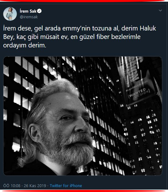 Sosyal medyanın esprili ve keyifli yüzü İrem Sak, Instagram hesabını aktif olarak kullanan isimler arasında… Son derece esprili ve renkli içeriklerle takipçilerinin şaşırtan Sak, bu defa da Haluk Bilginer’le ilgili bir paylaşıma imza attı. Dün akşam Amerika’da gerçekleştirilen Uluslararası Emmy Ödül Töreni’nde başrolünde yer aldığı Şahsiyet dizisi ile ‘En İyi Erkek Oyuncu’ ödülünü kaldıran Haluk Bilginer’in fotoğrafını Twitter hesabından paylaşan Sak, Bilginer’in kazandığı ödülle ilgili olarak şu satırları yazdı: “İrem dese, gel arada Emmy'nin tozunu al, derim Haluk Bey, kaç gibi müsait ev, en güzel fiber bezlerimle ordayım derim”