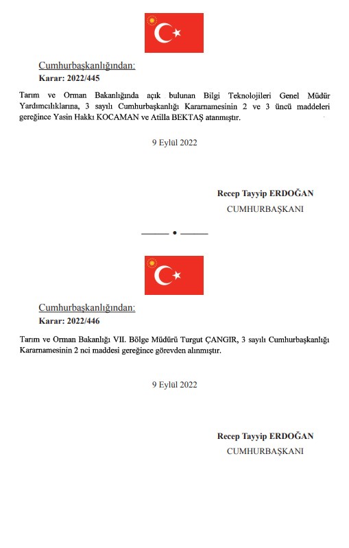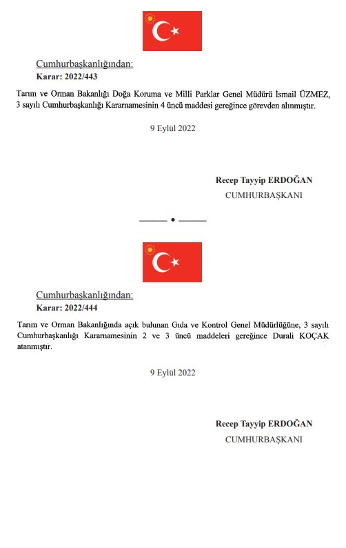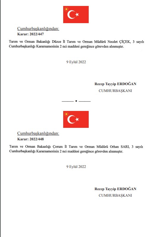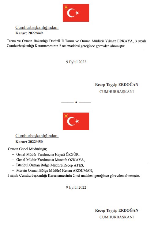 AKP'li Cumhurbaşkanı Recep Tayyip Erdoğan'ın imzasını taşıyan kararnamelerle atama ve görevden alma kararları Resmi Gazete'de yayımlandı. Çok sayıda bakanlık ve kurumda görevden almalar gerçekleşti. Özellik Tarım ve Orman Bakanlığı ile bağlı kuruluşlardaki görevden almalar dikkat çekti. İstanbul Orman Bölge Müdürü Recep Ateş de görevden alınanlar arasında.İMAR İZNİ VEREN MÜDÜR GÖREVDEN ALINDI