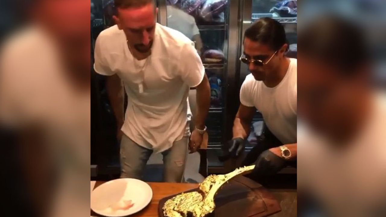 Bayern Münih'te forma giyen Fransız futbolcu Frank RiberyNusret'in Dubai şubesinde 7 bin 500 TL değerinde altın kaplama antrikot yedi.