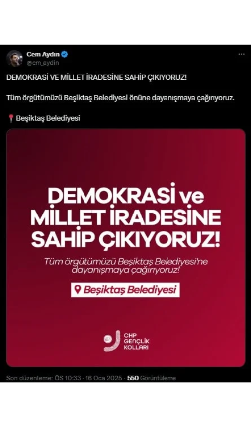 CHP Genel Merkez Gençlik Kolları Başkanı Cem Aydın sosyal medya hesabından yaptığı paylaşımda şu ifadeleri kullandı: