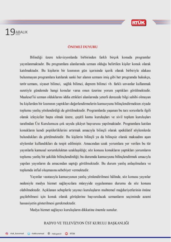 Bağımsız medya kuruluşu olan TELE1 ve muhalif medya organlarına kestiği cezalarla sürekli gündem olan RTÜK yaptığı duyuruda programlara çıkacak konuklara dair "uyarı" yaptı. RTÜK yaptığı duyuruda, "Gün içerisinde içerik olarak birbiriyle alakası bulunmayan programlara katılarak sanki her alanın uzmanı imiş gibi her programda hukukçu, terör uzmanı, siyaset bilimci, deprem bilimci vb. farklı unvanlar kullanmak suretiyle gündemde hangi konular varsa sonun üzerine yorum yaptıkları görülmektedir. ... Bu kişilerin bilinçli ya da bilinçsiz olarak maksadını aşan söylemler kullandıkları da tespit edilmiştir. Amacından uzak yorumlara yer verilen bu tür yayınlara kamusal sorumluluktan uzaklaştırdığı; söz konusu konukların yaptıkları yorumların toplumu yanlış bir şekilde bilinçlendirdiği; bu durumda kamuoyunu bilinçlendirmek amacıyla yapılan yayınların da amacından saptığı görülmektedir" ifadeleri kullanıldı. İşte o açıklama;