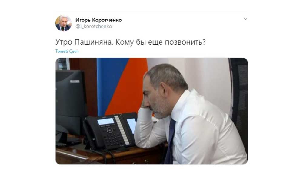 Rus askeri uzman İgor Korotçenko Paşinyan'ın fotoğrafını Twitter hesabından paylaşarak "Paşinyan'ın sabahı: Kimi arasam?" notunu düştü. Rus uzmanın paylaşımı kısa sürede sosyal medyada gündem oldu.