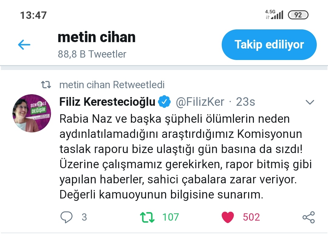 12 Nisan 2018'de Giresun Eynesil'deki evinin önünde yaralı bulunan ve daha sonra kaldırıldığı hastanede yaşamını yitiren Rabia Naz'ın ölüm nedenine ilişkin ihtimallerin değerlendirildiği komisyonun taslak raporunda "Rabia Naz Vatan'ın ikametinin bulunduğu binanın terasından yan tarafta bulunan fındıklık alana düşme sonucu gerçekleşme ihtimalinin kuvvetle muhtemel olduğu değerlendirilmektedir" görüşüne yer verildi. Komisyon üyelerinden HDP Ankara milletvekili Filiz Kerestecioğlu "Komisyonun taslak raporunun kendilerine ulaştığı gün basına sızmasını" eleştirerek "Üzerine çalışmamız gerekirken rapor bitmiş gibi yapılan haberler, sahici çabalara zarar veriyor" ifadelerini kullandı. Rabia Naz Vatan'ın babası Şaban Vatan hazırlanan taslak rapora ilişkin, hiçbir şey yapılmadığını görüyoruz, TBMM Araştırma Komisyonu Başkanı ve AKP Aksaray Milletvekili Cengiz Aydoğdu'nun bu süreçte hiçbir görüşme gerçekleştirmediğini delillerin karartılmaya devam edildiğini söyledi. "Rapora tam hali verilmemiş. Cengiz Aydoğan ile hiçbir görüşme yapılmıyor. Gelinen noktada hiçbir konuya açıklık getirilemedi. Demirören Haber Ajansı daha önce yalan haber yapmıştı. Gündeme getirmiştim bu konuyu kendisinden hala bir açıklama göremedim. Taleplerimiz yerine getirilmedi. Bayramdan sonra toplantı yapılacağı bir değerlendirme alınacağını öğrendim. Cumhuriyet Başsavcısı Abdürrahim Alan'ın Rabia'nın ölümü için araç çarpması diyemeyiz dediğini biliyorum. Kamuoyunu oyalama süreci devam ediyor. Cemal Enginyurt, bir canlı yayında verdiği röpörtajda sol ayak parçalanmış diyor, elbiselerinde sürtünme durumu yok diyor. Meclis komisyonuna tüm bunlar sorulmuş. Saklanmaya devam ediliyor. Ayrıca inceleme polisi Selim Aktaş zaten ifadesinde çanta görmediklerini itiraf etmişti. İkincisi Selim Aktaş herhangi bir ize bulguya rastlamadığını söylüyor düşmeyle ilgili olarak. Kasıtlar ortada, talimatlı bir durum çevirmişler. Otopsiyi inceleyen savcıdan aldığımız bilgiler rapora işlemedi. Her şeyiyle oynanmış. Bu komisyon yalnıza Rabia Naz için kurulmadı tüm çocuk ölümlerini araştırmak için kuruldu. Leyla Aydemir cinayetiyle ilgili bir şey göremiyoruz, 2,5 yaşındaki Muhammed Karslıoğlu ile ilgili de bir şey göremiyoruz. "Msj okunmuş . Hala geri dönmedi . Böyle milletin yüce Vekilligini yapıyorlar . Milleti Temsil Etmek bu değildir . Bu Hal Ne olursa olsun Patron ne derse o dur . Lanet olsun çocuk canını örtbas eden siyasetciye ve bile bile Vicdansizlik yapanlara pic.twitter.com/pEZkxelbYC