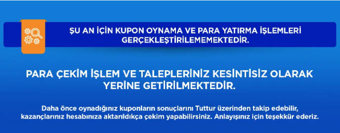 ŞU AN İÇİN KUPON OYNAMA VE PARA YATIRMA İŞLEMLERİ GERÇEKLEŞTİRİLEMEMEKTEDİR.