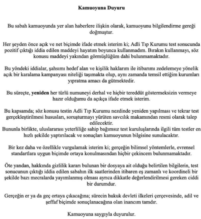 Her şeyden önce açık ve net biçimde ifade etmek isterim ki; Adli Tıp Kurumu test sonucunda pozitif çıktığı iddia edilen maddeyi hayatım boyunca kullanmadım.
