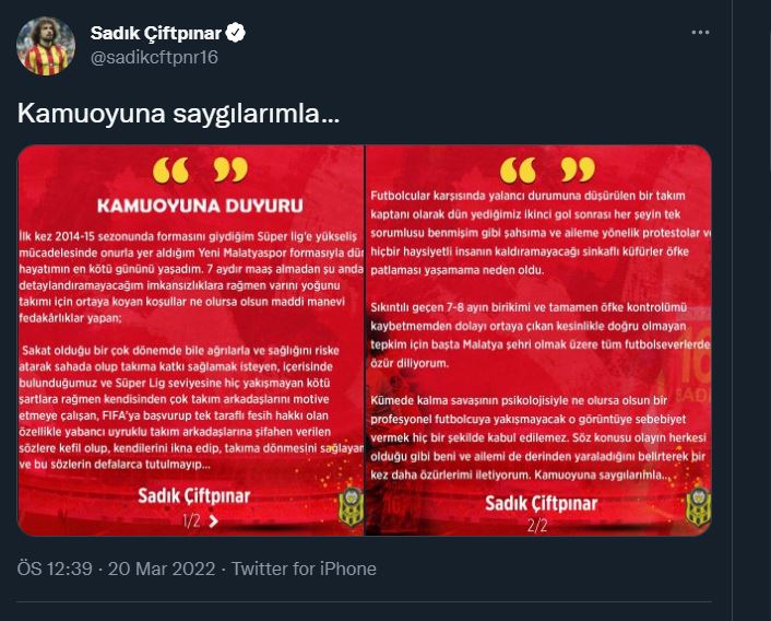 “İlk kez 2014-15 sezonunda formasını giydiğim Süper Lig’e yükseliş mücadelesinde onurla yer aldığım Yeni Malatyaspor formasıyla dün hayatımın en kötü gününü yaşadım. 7 aydır maaş almadan şu anda detaylandıramayacağım imkansızlıklara rağmen varını yoğunu takımı için ortaya koyan koşullar ne olursa olsun maddi manevi fedakarlıklar yapan; Sakat olduğu birçok dönemde bile ağrılarla ve sağlığını riske atarak sahada olup takıma katkı sağlamak isteyen, içerisinde bulunduğumuz ve Süper Lig seviyesine hiç yakışmayan kötü şartlara rağmen kendisinden çok takım arkadaşlarını motive etmeye çalışan, FIFA’ya başvurup tek taraflı fesih hakkı olan özellikle yabancı uyruklu takım arkadaşlarına şifahen verilen sözlere kefil olup, kendilerini ikna edip, takıma dönmesini sağlayan ve bu sözlerini defalarca tutamayıp… Futbolcular karşısında yalancı durumuna düşürülen bir takım kaptanı olarak dün yediğimiz ikinci gol sonrası her şeyin tek sorumlusu benmişim gibi şahsıma ve aileme yönelik protestolar ve hiçbir hassasiyetli insanın kaldıramayacağı sinkaflı küfürler öfke patlaması yaşamam neden oldu. Sıkıntılı geçen 7-8 ayın birikimi ve tamamen öfke kontrolümü kaybetmemden dolayı ortaya çıkan kesinlikle doğru olmayan tepkim için başta Malatya şehri olmak üzere tüm futbolseverlerden özür dilerim. Kümede kalma savaşının psikolojisiyle ne olursa olsun bir profesyonel futbolcuya yakışmayacak o görüntüye sebebiyet vermek hiçbir şekilde kabul edilemez. Söz konusu olayın herkesi olduğu gibi beni ve ailemi de derinden yaraladığını belirterek bir kez daha özürlerimi iletiyorum. Kamuoyuna saygılarımla…”