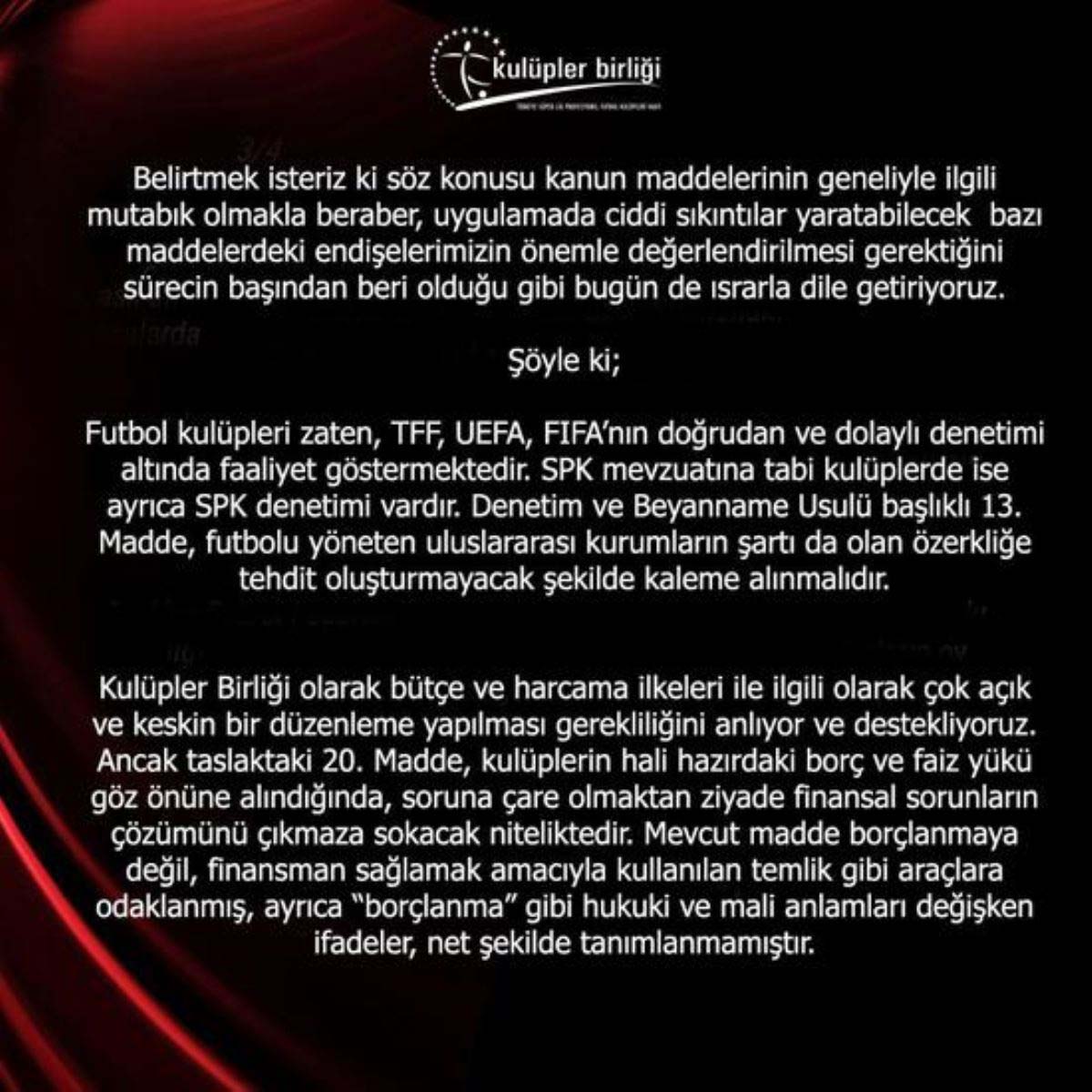 Kulüpler Birliği, MHP milletvekili Saffet Sancaklı'nın TBMM'de kulüp başkanlarına yönelik söylediği sözlerden özür dilemesine ve yeni spor yasasındaki değişiklik taleplerine yönelik açıklamalarda bulundu.