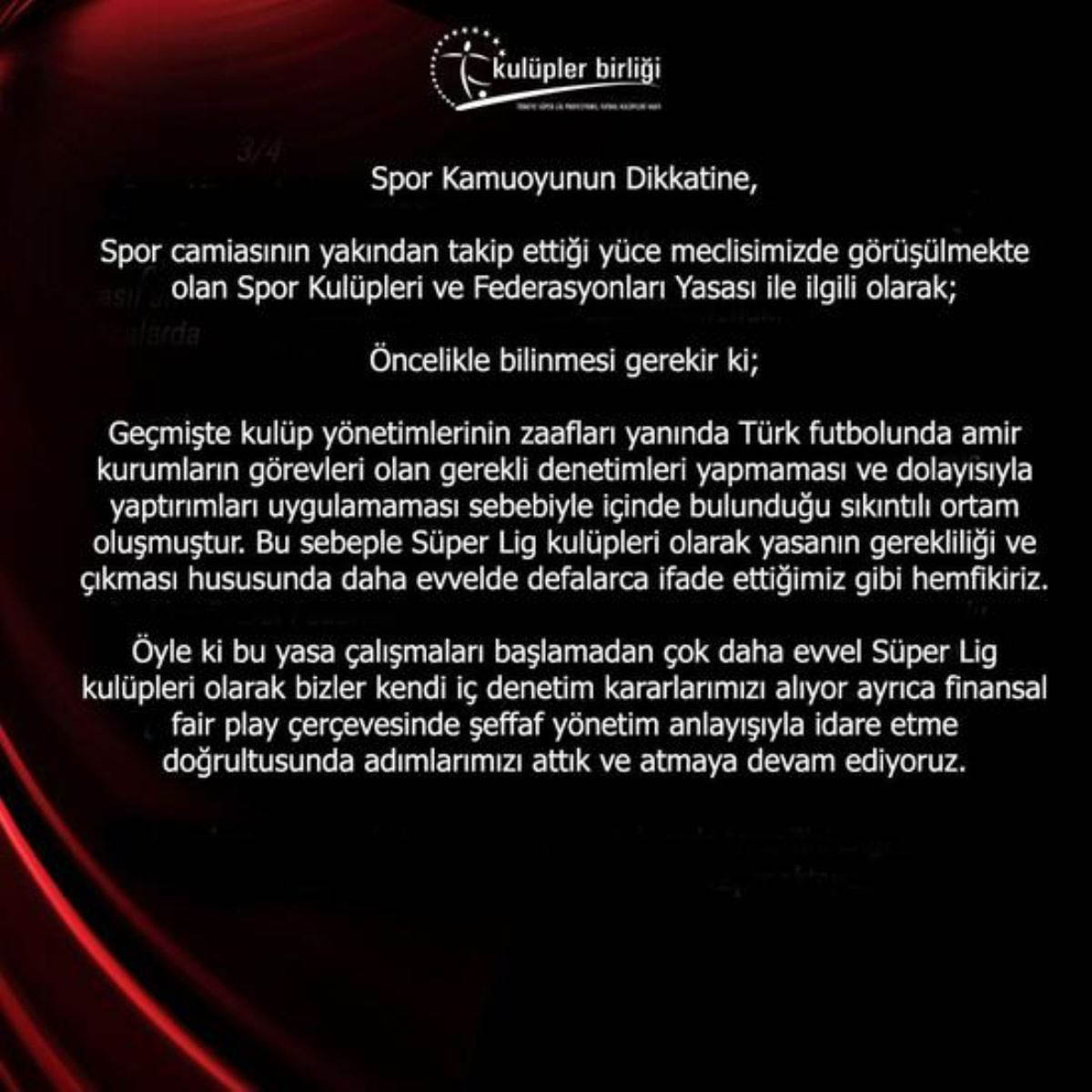 Süper Lig Kulüpler Birliği, son günlerin gündem maddelerinden TBMM'de görüşülen spor yasasının bazı maddelerinin yeniden gözden geçirilmesiyle ilgili açıklama yayınladı. Yapılan açıklamada ayrıca eski Milli futbolcu Saffet Sancaklı'ya da cevap verilerek tüm kulüp başkanlarından özür dilemeye çağrıldığı belirtildi.İşte Kulüpler Birliği'nden yapılan o açıklama: