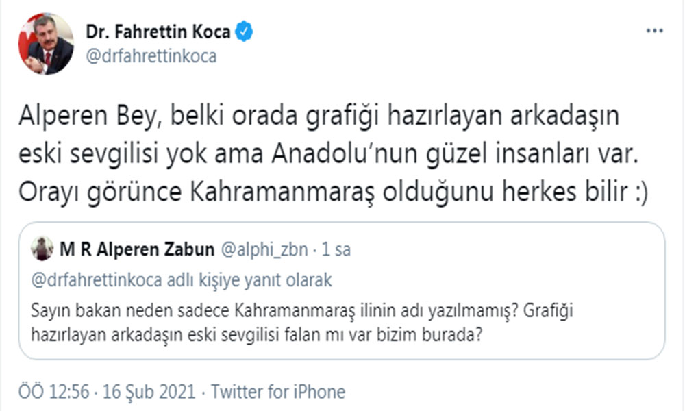 Sağlık Bakanı Fahrettin Koca, son basın toplantısında illere göre vaka sayısını paylaşacağını belirtmişti. Sosyal medya hesabı üzerinden paylaşım yapan Koca, 81 ilin son 7 günlük vaka tablosunu açıkladı. Koca'nın açıkladığı tabloda, Kahramanmaraş'ın ismine yer verilmemesi üzerine, bir sosyal medya kullanıcısı tarafından, ''Sayın bakan neden sadece Kahramanmaraş ilinin adı yazılmamış? Grafiği hazırlayan arkadaşın eski sevgilisi falan mı var bizim burada'' ifadelerini kullanarak Koca'ya tepki gösterdi.''KAHRAMANMARAŞ OLDUĞUNU HERKES BİLİR''