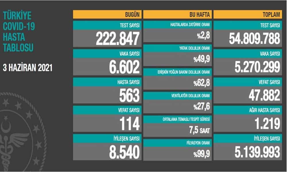 Sağlık Bakanlığı verilerine göre Türkiye'de son 24 saatte 222 bin 847 Covid-19 testi yapıldı, 6 bin 602 kişinin testi pozitif çıktı, 114 kişi hayatını kaybetti.
